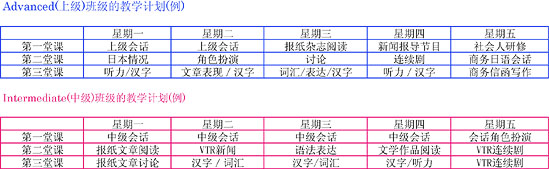 ※在針對升學的教學計畫中,會話角色扮演,VTR連續劇,報紙討論,VTR新聞的時間會改為準備升學的教學內容